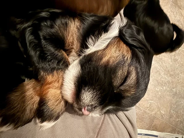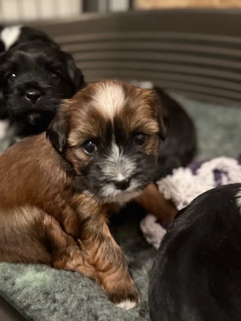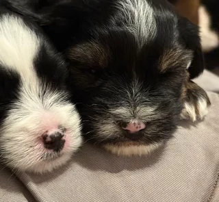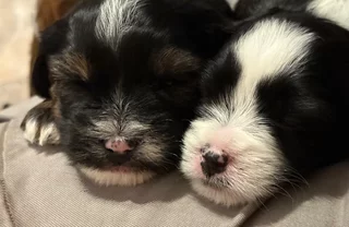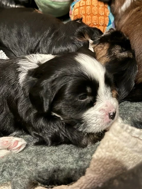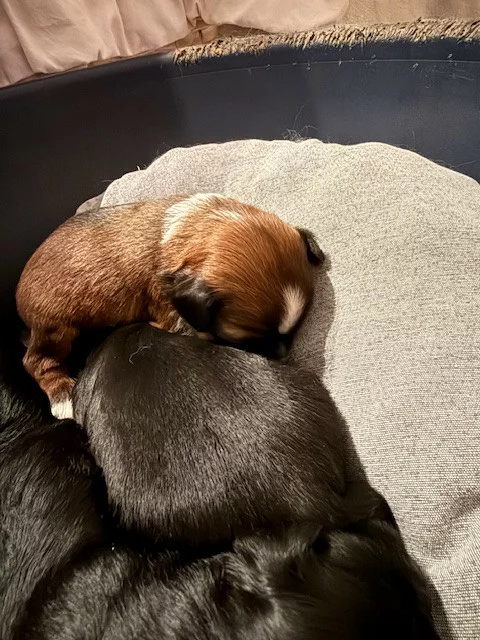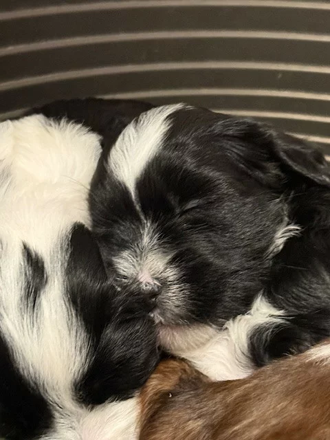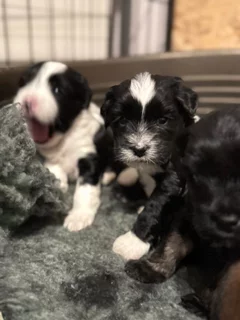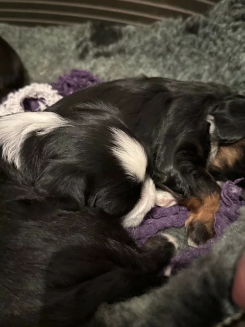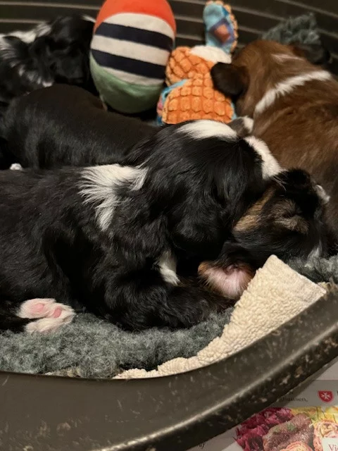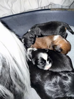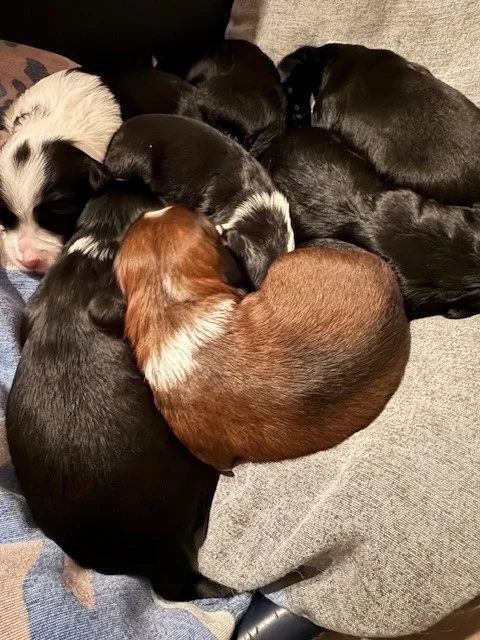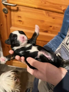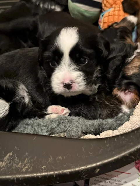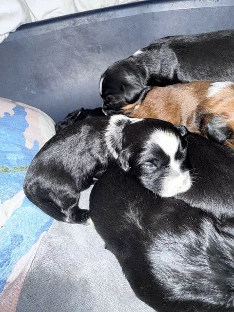 Dazu gesellen sich noch 4 Hündinnen in: schwarz-weiß wie Ruby, tricolor ( scharz, weiß mit tan Abzeichen ), schwarz mit wenig weiß sowie in zobel.